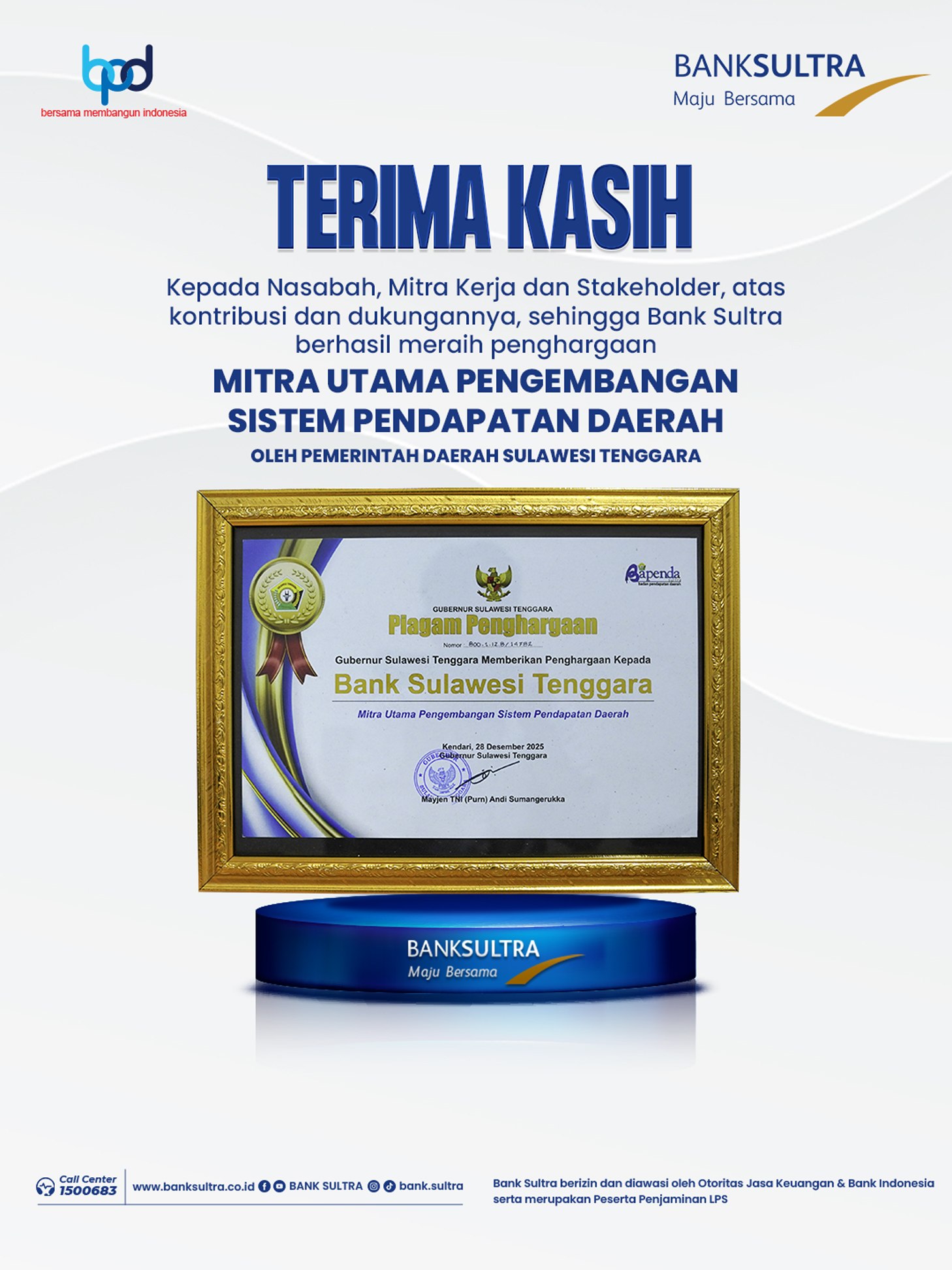 Penghargaan tersebut diserahkan langsung oleh Gubernur Sulawesi Tenggara, Andi Sumangerukka, dan diterima secara simbolis oleh Direktur Kepatuhan Bank Sultra, Taufik Akbar, sebagai bentuk apresiasi atas kontribusi aktif Bank Sultra dalam mendukung optimalisasi dan transparansi penerimaan daerah.