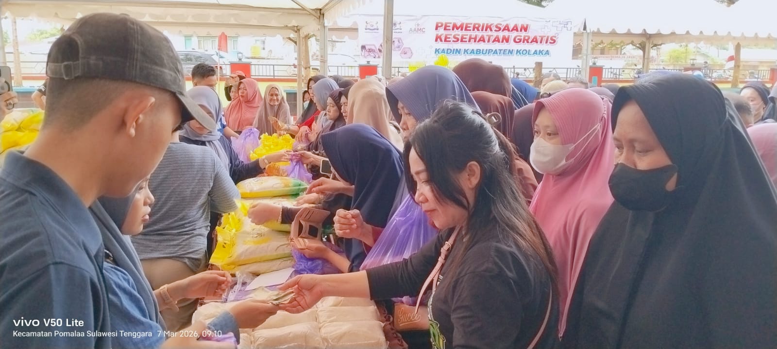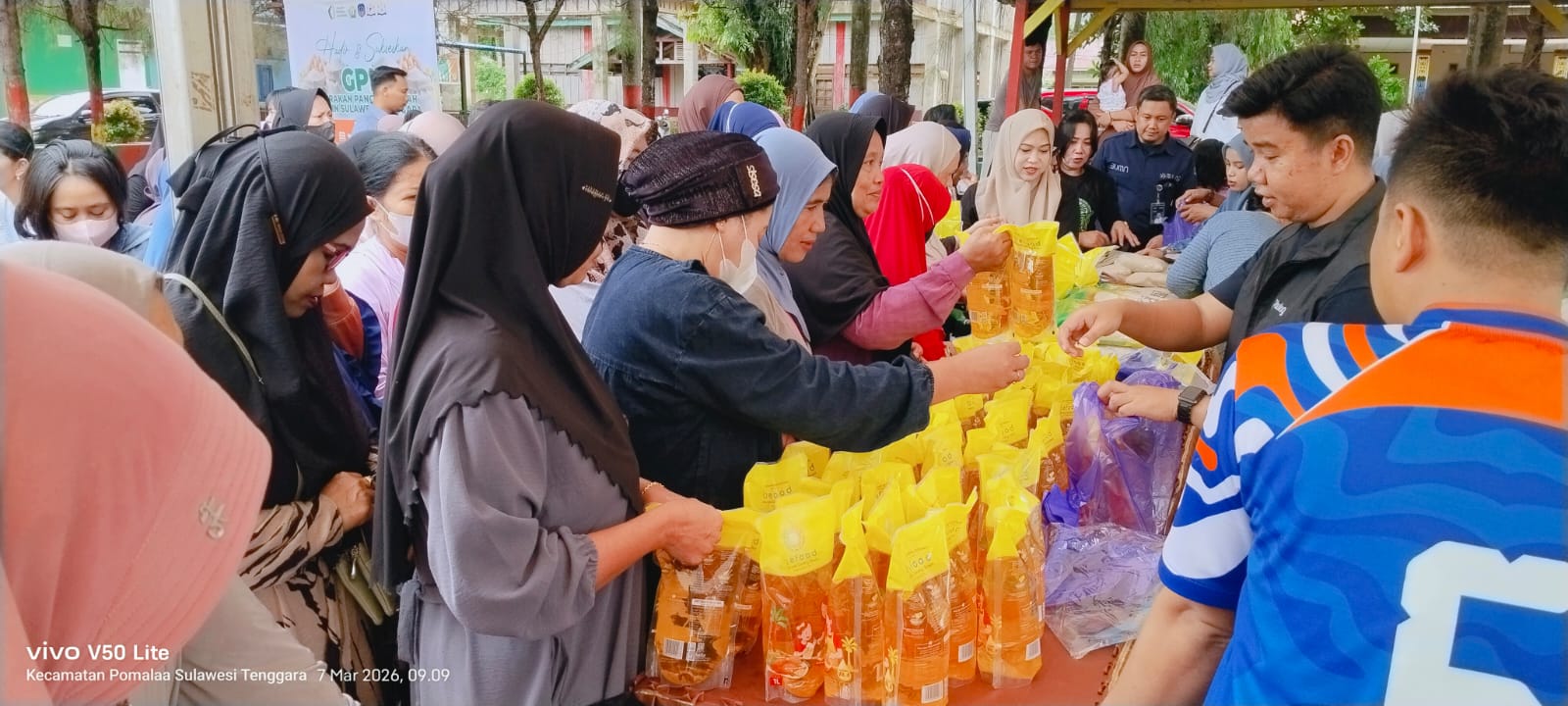 Sejak dibuka pukul 09.00 Wita, pekarangan Kantor Camat Pomalaa dipadati warga yang datang untuk membeli komoditas pangan murah yang disiapkan Kadin Sultra bersama Kadin Kolaka.