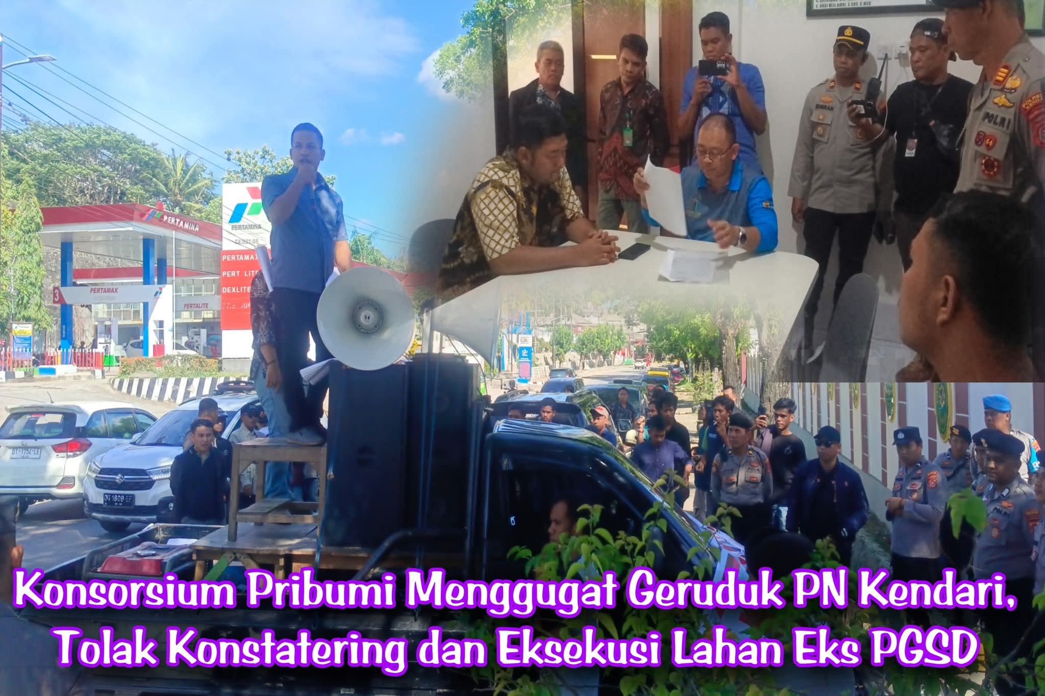 Kendari, Sentralsultra.com – Sejumlah massa yang tergabung dalam Konsorsium Pribumi Menggugat menggelar aksi demonstrasi di depan Kantor Pengadilan Negeri (PN) Kendari, Jumat 14/11/2025, menolak rencana konstatering dan eksekusi terhadap lahan eks PGSD yang diklaim milik Kikila Adi Kusuma.