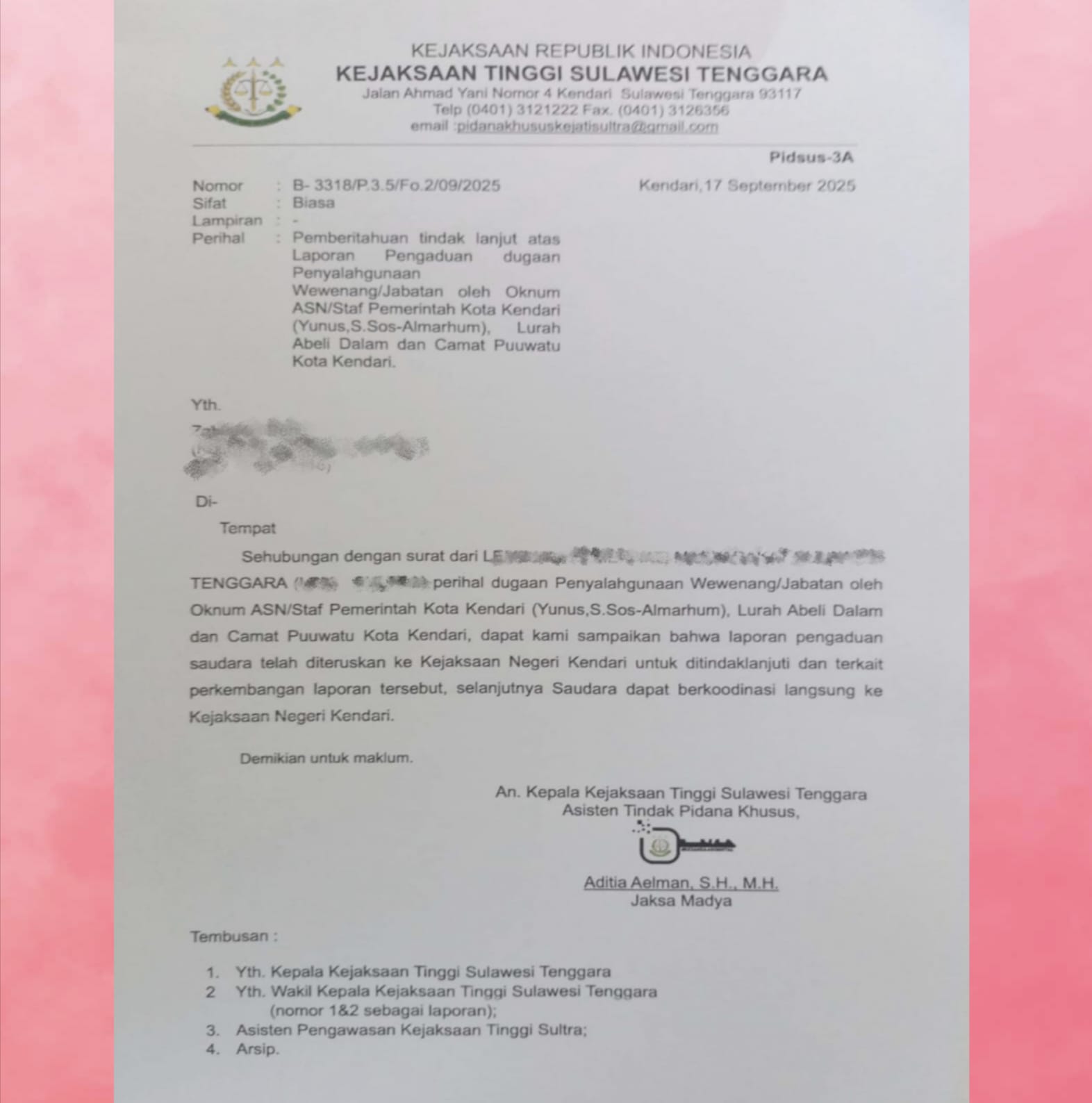 Atas dugaan penyalahgunaan wewenang dan pelanggaran asas-asas umum pemerintahan yang baik, seorang penggiat hukum di Sulawesi Tenggara melaporkan perkara ini ke Kejaksaan Tinggi (Kejati) Sultra. Melalui surat resmi bernomor B-3318 / P.3.5 / Fo.2 / 09/2025 tertanggal 17 September 2025, Kejati Sultra menyatakan laporan tersebut telah dilimpahkan ke Kejari Kendari untuk dilakukan penelaahan dan penanganan lebih lanjut.