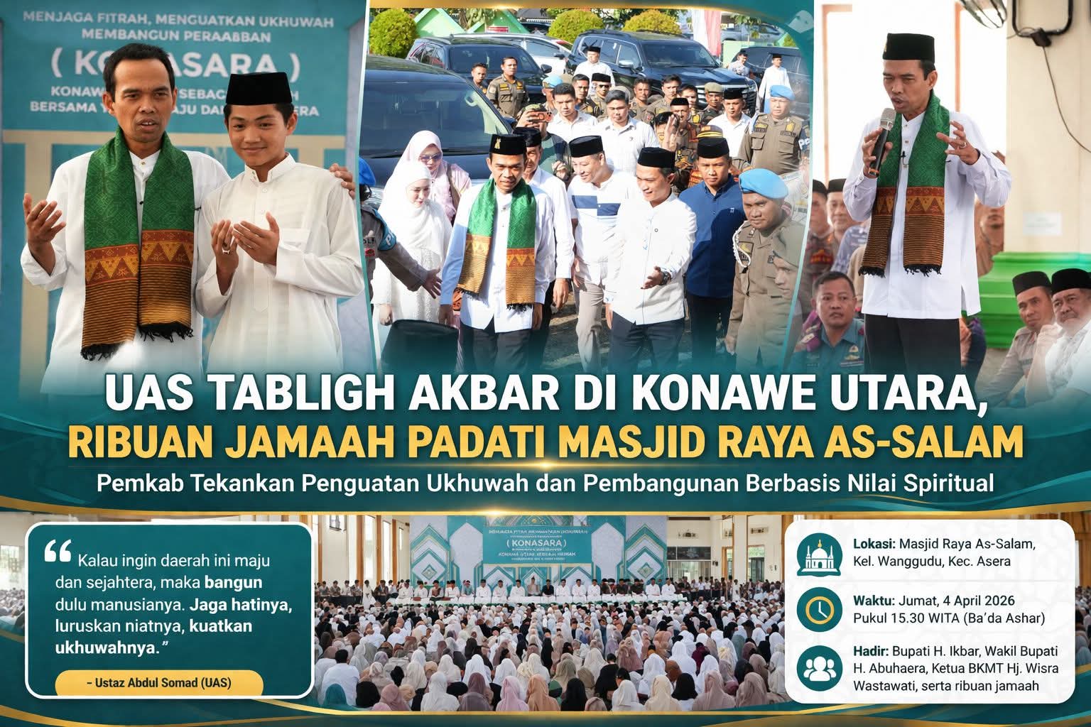 “Kalau ingin daerah ini maju dan sejahtera, maka bangun dulu manusianya. Jaga hatinya, luruskan niatnya, kuatkan ukhuwahnya,” ujar UAS yang disambut antusias jamaah.